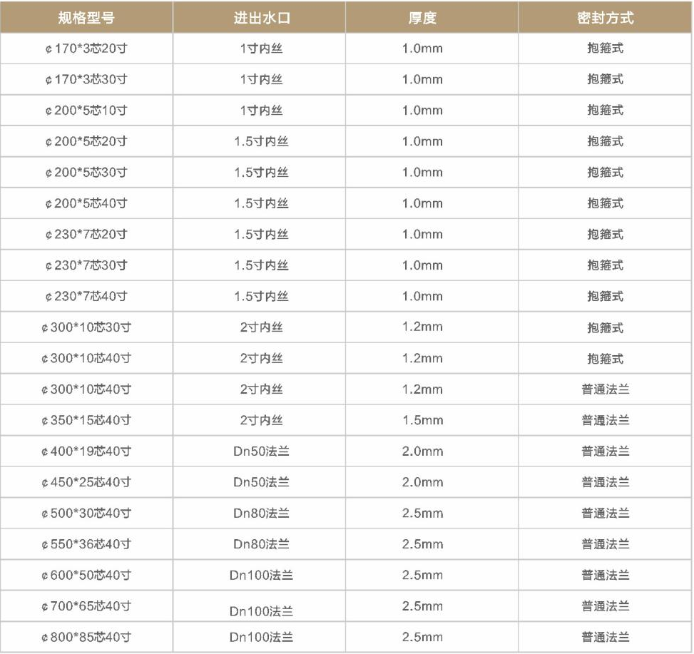 適合領(lǐng)域: 1、純水、瓶裝水的精濾、各種工業(yè)用水的澄清處理。 2、各種化工溶液和提純。 3、水處理及醫(yī)藥、酒、飲料等澄清與濃縮等。 產(chǎn)品特點(diǎn): 1、殼體材料:不銹鋼304或316L。 2、濾芯: PP棉、碳棒等。 3、濾芯長度:10" 20" 30" 40"。 4、可承受壓力:≤0.8Mpa。 5、表面處理:鏡面或啞光(噴砂)。